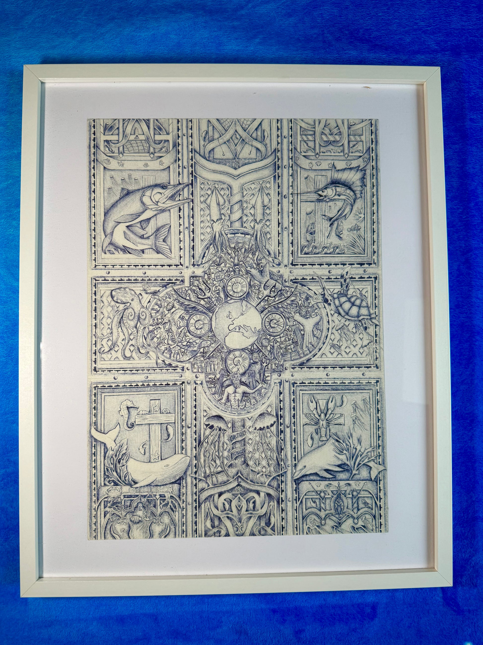 Plongez dans l’immensité de “Oceans”, une œuvre où la richesse et la puissance des mers prennent vie à travers des milliers de traits d’encre. Chaque créature, chaque motif ornemental compose une fresque symbolique dédiée à la beauté et au mystère des profondeurs.