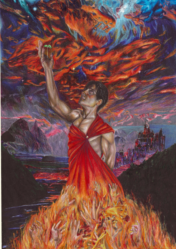 Chaque détail, de l’éclat des flammes aux nuances célestes, des textures charnelles aux contrastes symboliques, a été travaillé avec intensité pour offrir une vision saisissante. Une création qui incarne la puissance de l’Espoir, capable de naître même au cœur des ténèbres.