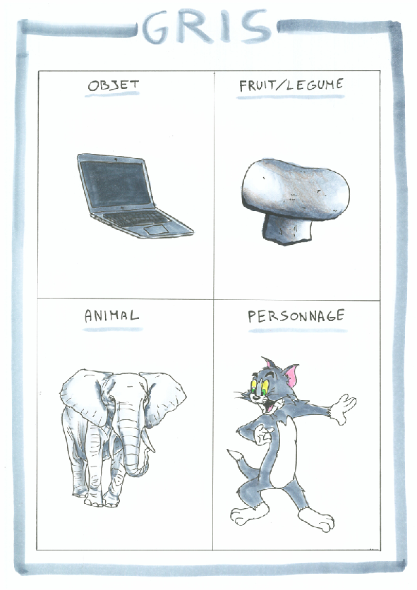 Explorez la sobriété élégante de « Petit Bac – Gris », une planche qui met en avant cette couleur à travers quatre représentations variées. Dans la case Objet, un ordinateur portable incarne la modernité et la technologie. Pour la catégorie Fruit/Légume, un champignon gris, simple mais réaliste, évoque la nature discrète. En Animal, la majesté de l’éléphant se déploie dans toute sa puissance tranquille. Enfin, la case Personnage s’anime avec le célèbre Tom du duo Tom & Jerry, figure emblématique du dessin animé.